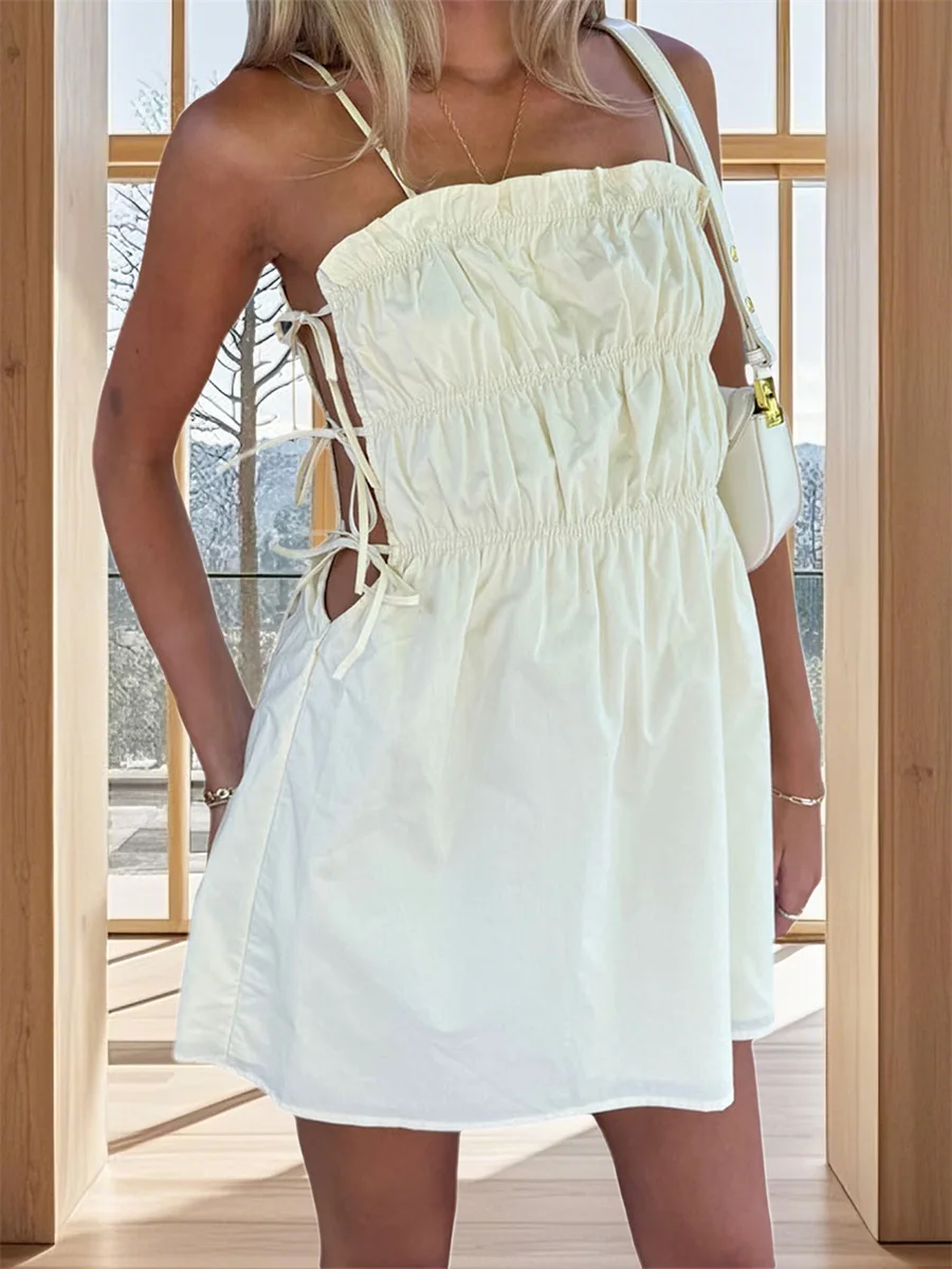Women Solid Spaghetti Strap Dress Frill Trim Square Neck Ruched Side Tie-up Backless A-line Mini Dress
