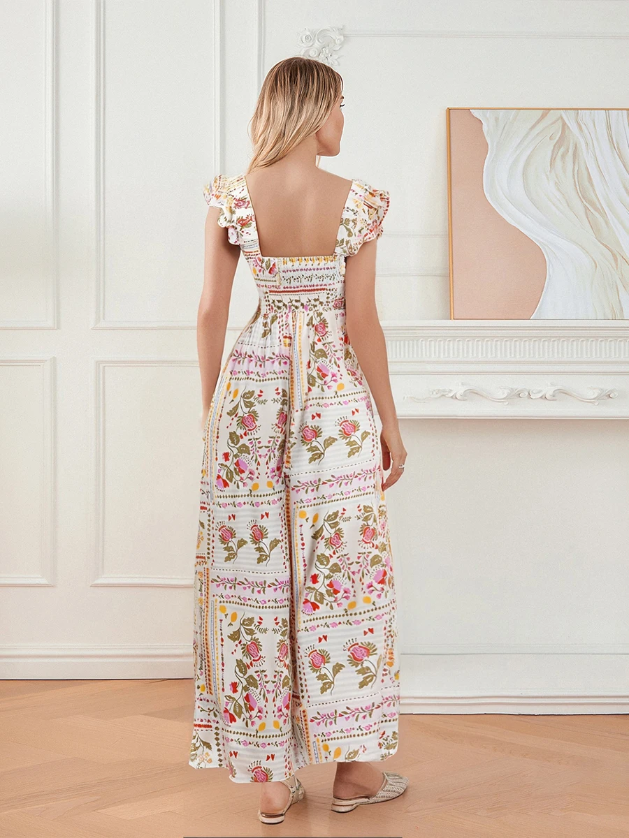 Women’s Summer Suspender Dress Retro Floral Print Sleeveless Square Neck Long A Line Dress