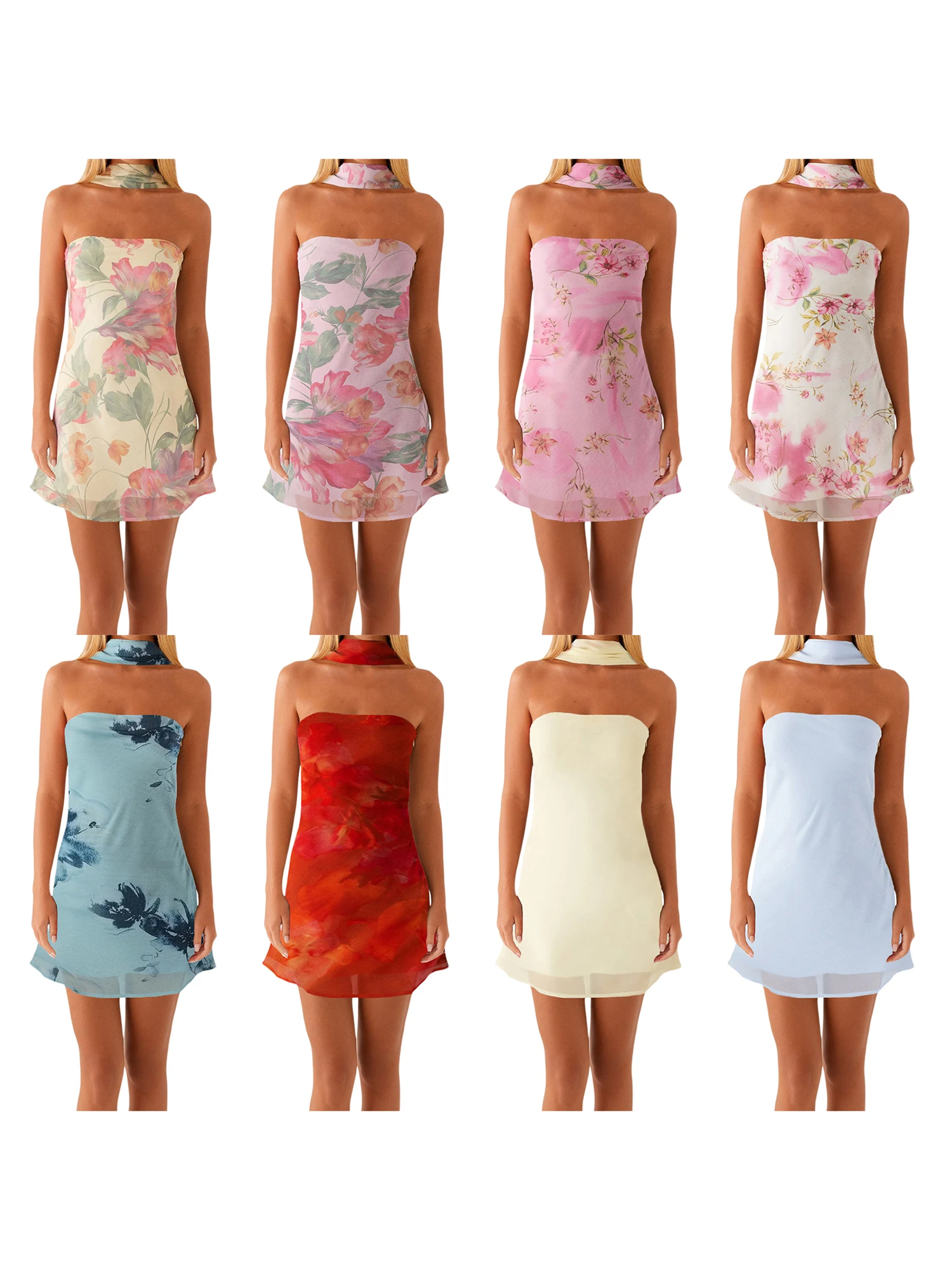 Women Mini Dress, Strapless Backless Flower/Solid Fit Summer Tube Dress Clubwear with Scarf
